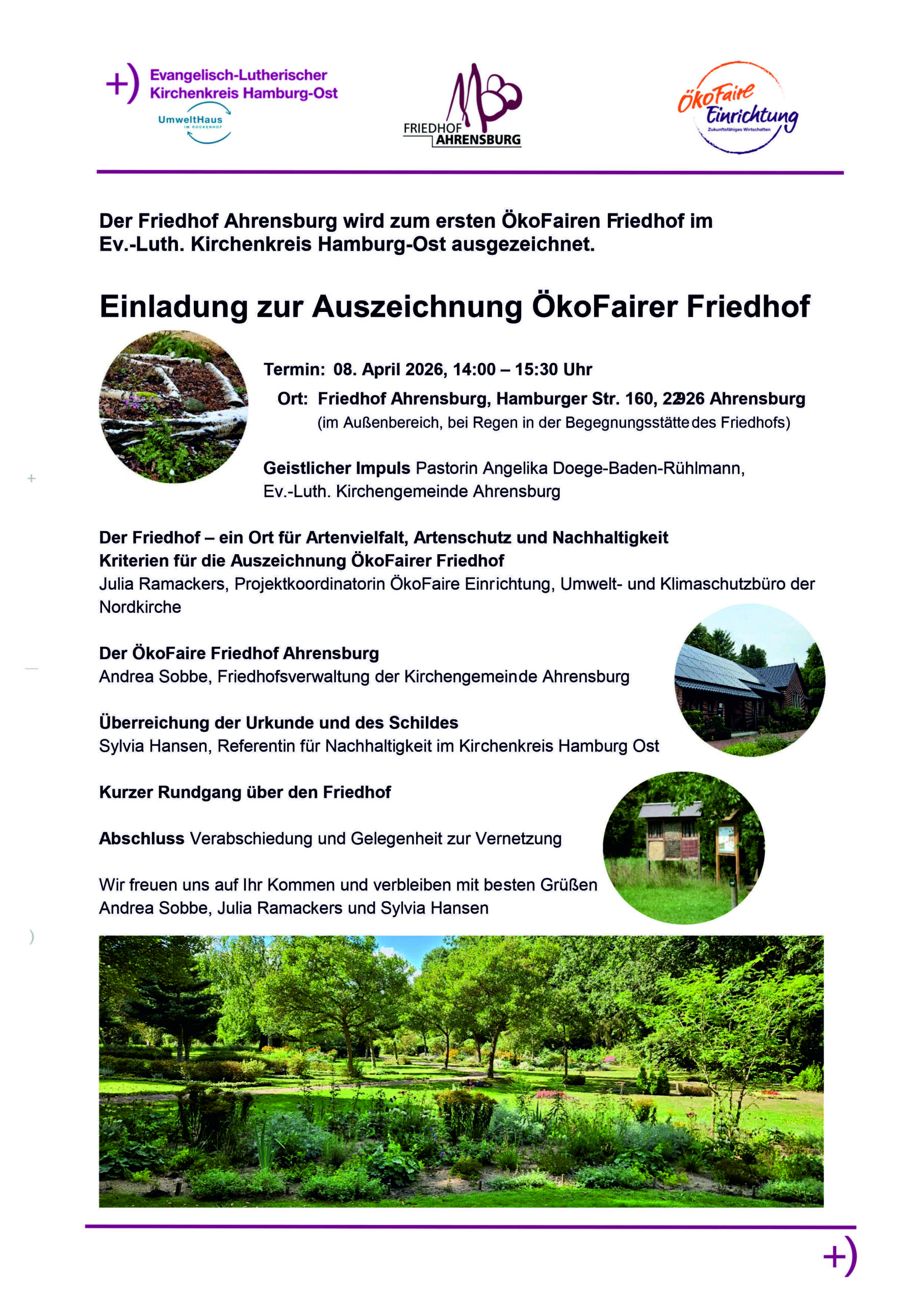 Wir freuen uns sehr, dass unser Ahrensburger Friedhof als erster ÖkoFairer Friedhof im Kirchenkreis Hamburg-Ost ausgezeichnet wird und möchten Sie herzlich einladen, bei der Auszeichnung mit Informationen zur Entstehungsgeschichte und einer kleinen Führung über den Friedhof dabei zu sein.